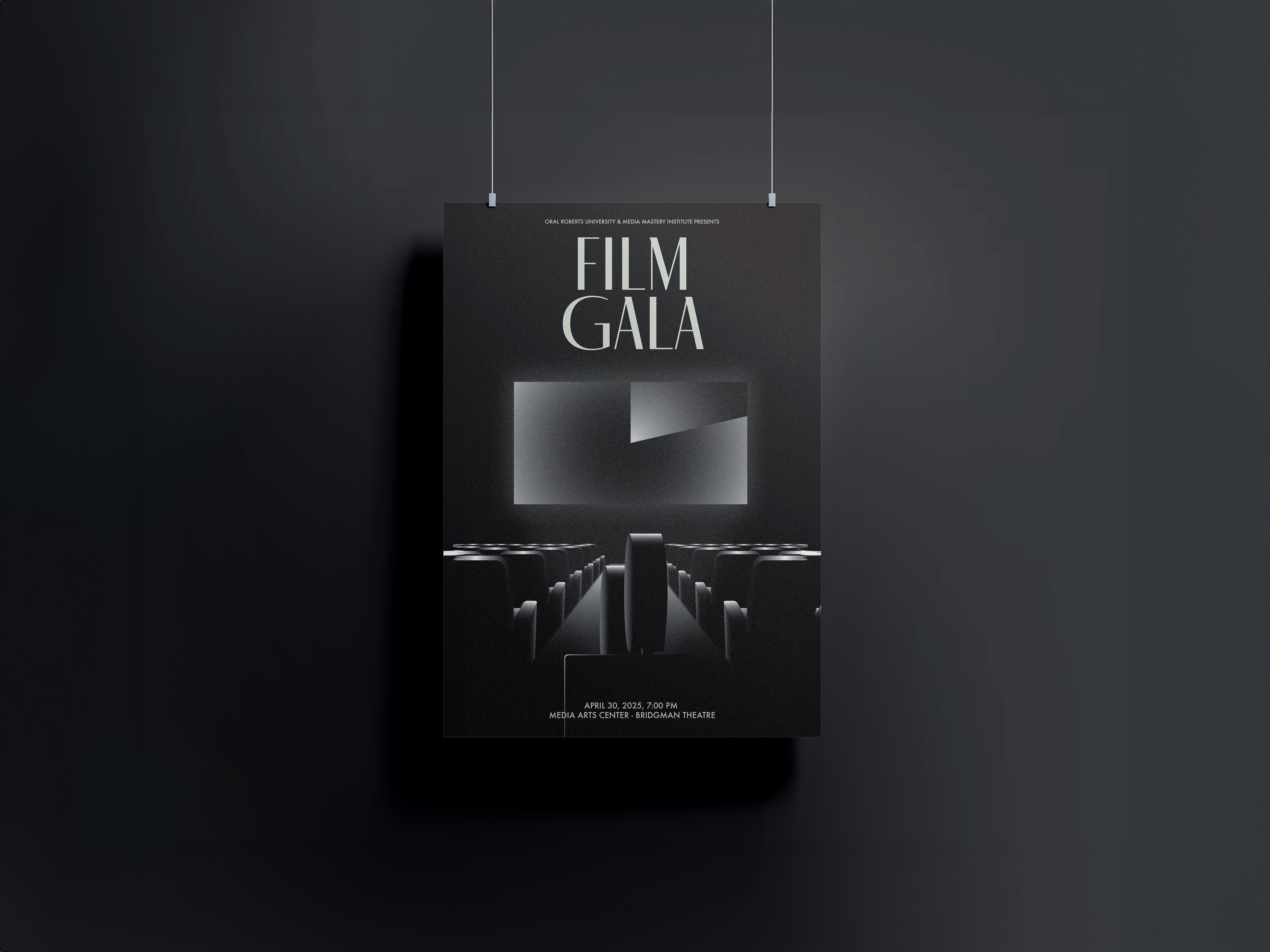 This poster was created to promote the Film Gala hosted by the Oral Roberts University Media Arts department. The event celebrated student films and marked the first Film Gala held in the university’s new Media and Performing Arts building.