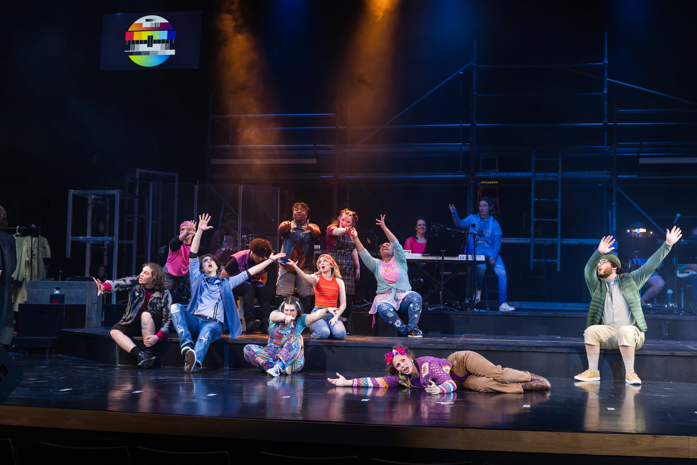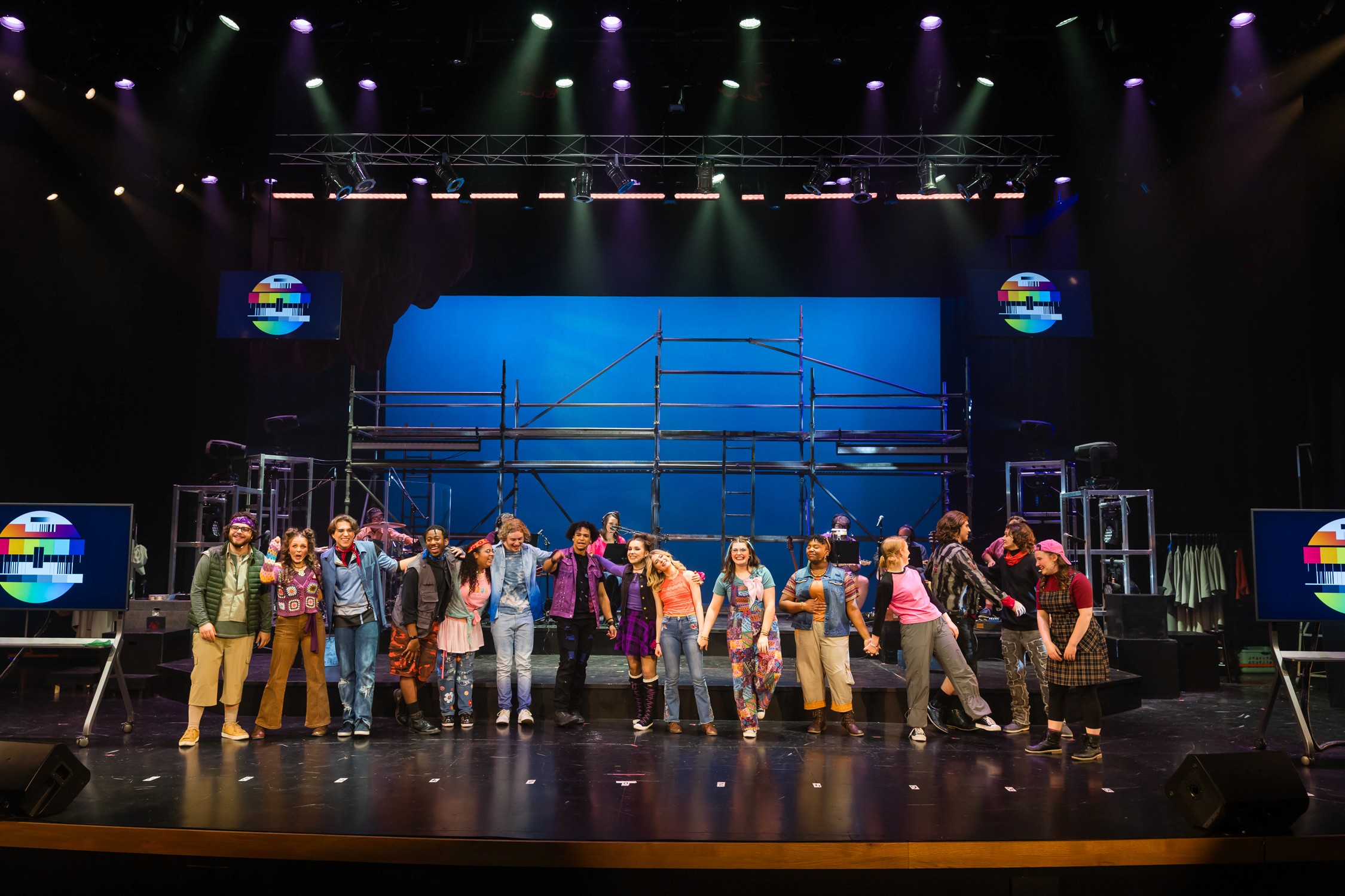The first step was understanding the story, the themes of the play, and the creative vision of the production team. Because the project involved several areas of the art department, especially visual and media arts, we explored inspiration from broadcast television, particularly the visual language of color calibration bars and tone used in TV monitors.